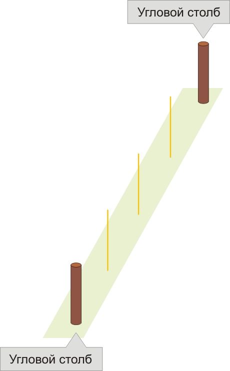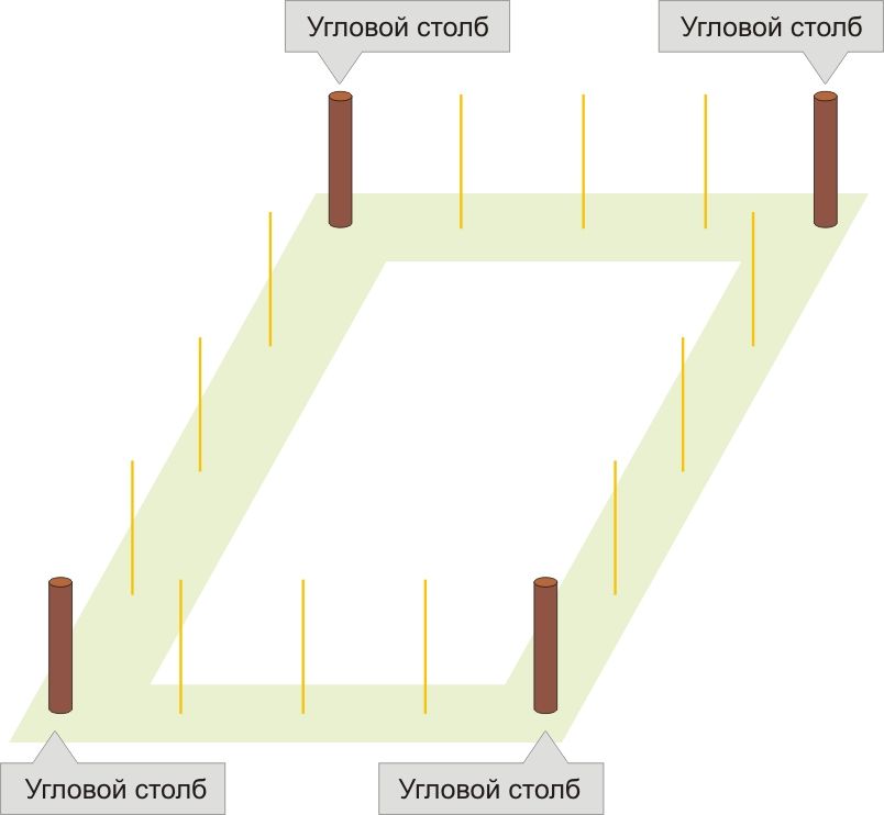 Если изгородь закольцована (огораживает участок вкруг): - вкопайте деревянные столбы необходимого размера (в комплект поставки не входят) по углам изгороди. |