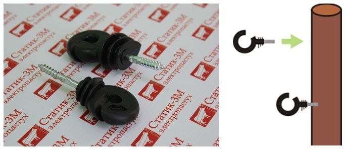 Вкрутите в установленные деревянные столбы кольцевые изоляторы. Количество кольцевых изоляторов, расположенных на одном столбе, должно соответствовать количеству токоведущих линий изгороди. |